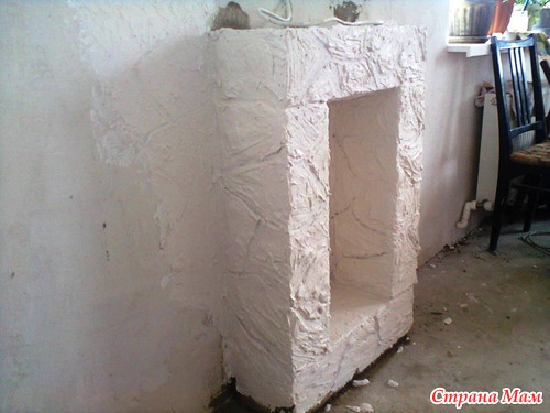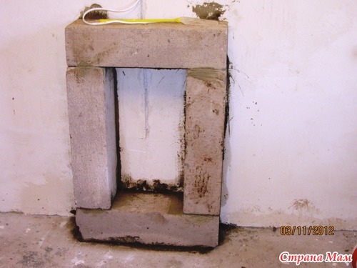 Гостиная у нас будет в стиле "кантри". Место под камин мы отвели по центру стены между двух окон. Топку необходимо строить из невозгораемых материалов. В нашем случае - пенобетон +шпатлевка.
