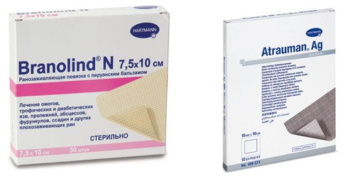 Среди наиболее эффективных повязок для лечения ран стоит отметить стерильную атравматическую повязку Бранолинд Н, которая представляет собой крупноячеистую сетку из натурального материала, пропитанную мазевой основой с перуанским бальзамом, который обладает мягким антисептическим и ранозаживляющим действием и стерильную атравматичную серебросодержащую повязку Атрауман Аг, обладающую выраженным антибактериальным эффектом. Основные преимущества атравматичных повязок Бранолинд Н и Атрауман Аг – безболезненность при использовании, быстрое заживление ран, а также высокая экономичность – повязки могут находиться на ране без смены до 3-7 дней.