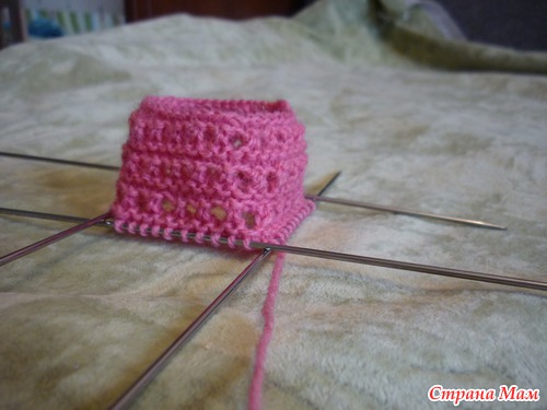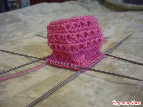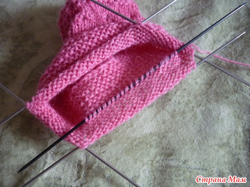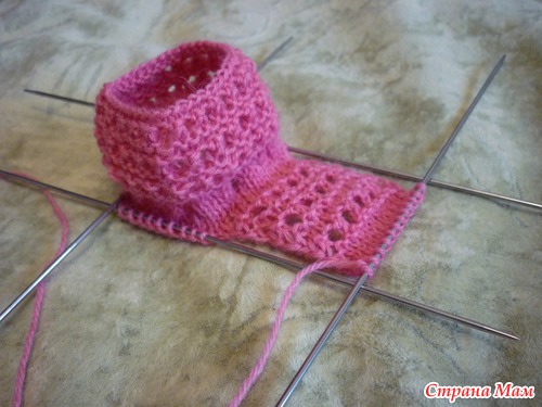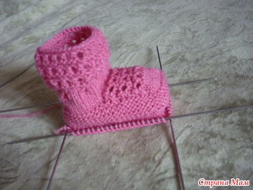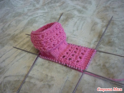 Дальше 4 ряда чулочной вязкой (на лицевой стороне – лицевая гладь).Получилась верхняя часть стопы.