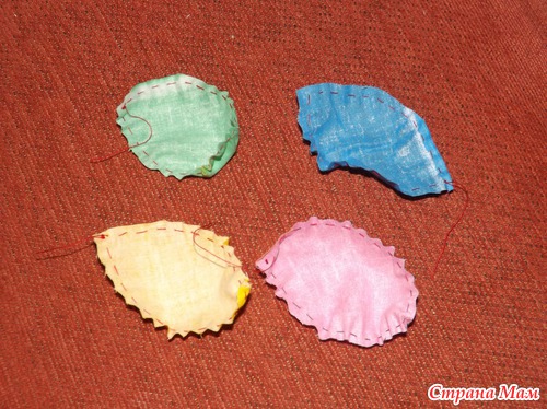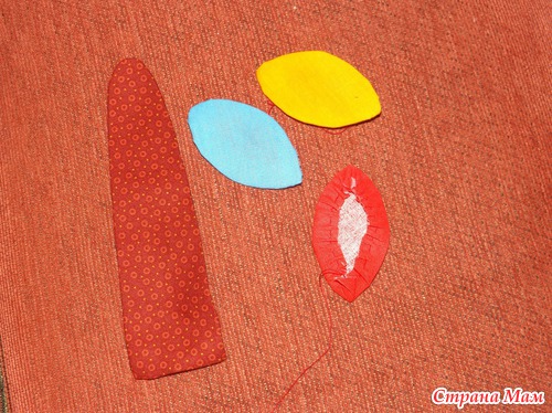 Вырезаем детали для аппликации из ткани по нашим шаблонам из картона, но с припуском примерно 0,7 см. Прометываем простым швом вперед иголка по всему периметру детали.