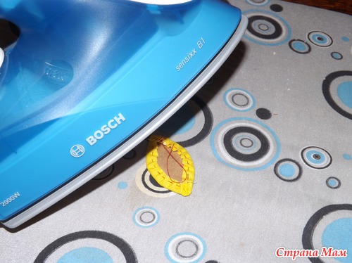 Утюжим. Паутинка хорошо и быстро приклеивает одну ткань к другой, много времени это не займёт. Всё. Теперь наши листочки и ствол держатся и никуда не убегут с предназначенного для них места!