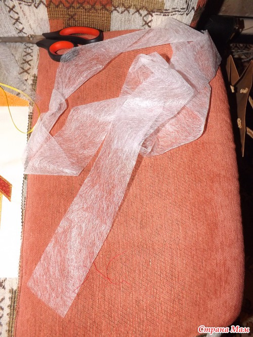 Теперь нужно приклеить детали паутинкой. Паутинка- это такой материал, который служит для того, чтобы склеивать ткани между собой. Продается в швейных и рукодельных магазинах единым полотном или на метраж. У меня вот такая широкая лента.