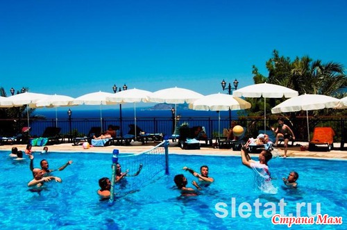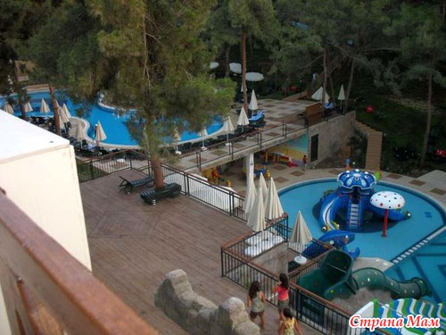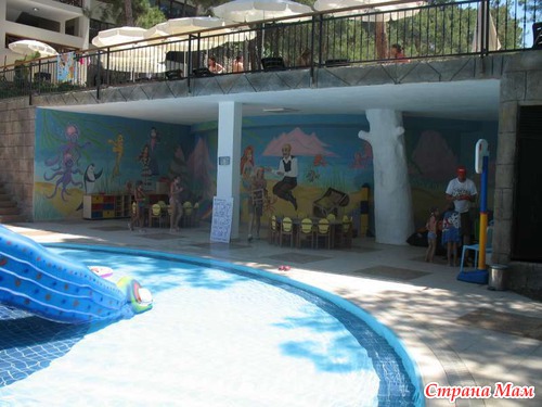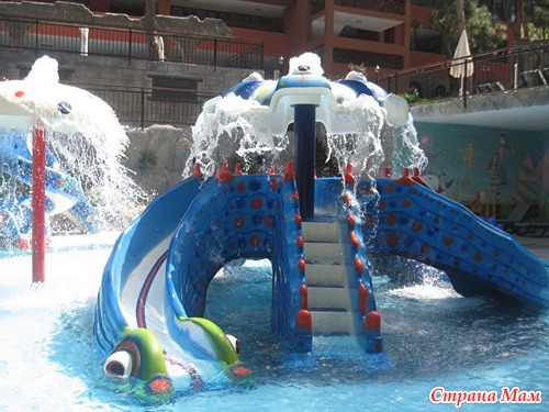 Для развлечений детей предусмотрены: детская анимация на русском языке, детское шоу, мини–клуб (4-12 лет), мини-диско в амфитеатре (каждый вечер), специальный детский буфет на ужин (если не ошибаюсь, в ресторане есть отдельный детский уголок), детские стульчики в ресторане, 2 открытых детских бассейна, 4 горки, закрытый бассейн, детская площадка, игровая комната, детские коляски (платно), няня (платно).