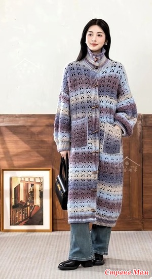 | Длинное пальто из секционной пряжи с воротником стойка и накладными карманами. Крючок. | |