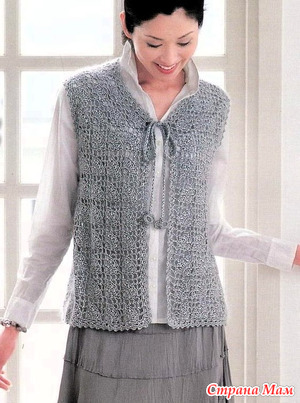 | Блестящий ажурный жилет связанный по диагонали. Крючок. | |