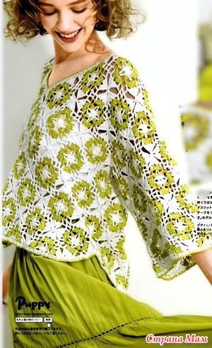 Яркий ярко-желтый узор эффектно смотрится и расположен по диагонали, создавая ощущение движения. V-образный вырез четкий, а подол закруглен и имеет разрез, добавляющий мягкости. Узор, созданный соединением мотивов, также привлекателен. Модель носит размер L.