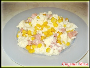 В начале слегка обжариваем ветчину, позже заливаем её омлетом. И в конце добавляем 3 столовых ложки консервированной кукурузы. Тушим 2 минуты и омлет готов! Приятного аппетита!!!