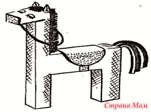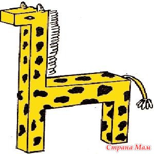 Эта игрушка подобна лошадке, но для спины склеивают два ряда горизонтальных коробков, а шею удлиняют, поставив еще один коробок. Завершив сборку, жирафа оклеивают желтой бумагой, рисуют ему глаза, приклеивают уши, гриву, хвост. Пятна приклеивают или рисуют такого же цвета, как и грива. Хвост должен быть желтым.