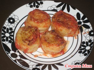 Скатываем в рулетик, закрепляем края, режим на кусочки по 3-4 см.