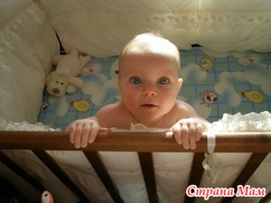 Маруська теперь встает в кроватке на колени, подтягивается руками за бортик и подглядывает за родителями вот вам и личная жизнь, а скоро и на ноги вставать начнет