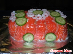 Когда уложен последний слой,края тоже лучше смазать.Сверху закрываем все красной рыбкой,украшение на ваш вкус