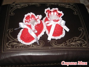 Эти пинетки я связала крючком! Они не теплые так как нитки обычные как на салфетки. Но они по моему мнению нарядные и подошли бы к красивому платишку! А если их сделать полностью белыми то для крестильного платья нет милей!!! А вы как думаете?