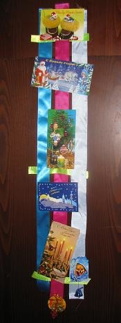 В прошлом году украсили дом вот такими " гирляндами". Делали всей семьёй Изначально были мысли пристроить архивные новогодние открытки. Взяли отрезы атласных лент разной ширины, разных цветов и с помощью клеевого пистолета соединяем их с открытками. Можно добавлять снежинки, лёгкие игрушки, колокольчики.