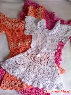 Платья для девочки 2-3 года. Связано крючком из хлопковых ниток. В ассортименте белое, розовое, абрикосовое, голубое.