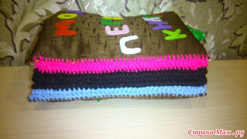 Мягкая развивающая книга сделанная своими руками. Задания в книги нацелены на развитие памяти, внимания, логического мышления, тактильного восприятия. Толщина книги - 12 см, высота страниц - 30 см, ширина -20 см. Страница №1: обложка с надписью "МОЯ ПЕРВАЯ КНИГА". Страница №2: яблоки и ягоды крепятся на крючки, можно хранить их в солнышке, которое открывается замком-молнией, грибок - на кнопке. Страница №3: лепестки - с разными наполнителями: ярко оранжевый - шуршит, в красном - квадратные бусины, в светло-оранжевом - большие круглые бусины, розовый наполнен ватой, в синем - маленькие круглые бусины. Крышка - откручивается. Под листком, красным лепестком и под крышкой пришиты бабочки. Страница №4: гусеница пришита на резинке, ее можно оттянуть, в лепестке можно перегонять бусины через дырочки. Страница №5: изучаются цифры и счет до 10. Страница №6: "домик" улитки - на липучке, в нем - пуговичка, которая перегоняется по кругу. Страница №7: изучаются цвета радуги, чтобы было интереснее, в радуге есть бусины и пуговички, которые можно передвигать вверх и вниз. Солнышко и тучка - на липучке. В траве бусина, которая просовывается через "петли", на подсолнухе пришиты бусины, с помощью которых можно делать массаж ладошек. Страница №8 и №9: морской конек и рыбка - на липучке, можно их менять местами, изучаются понятия "вверх-вниз", "вправо-влево". морская звезда и черепашка - на кнопках, их тоже можно менять местами. Осьминога можно подергать за "резиновые ножки". Страница №10: просунуть шнурок в кольца, цветок - на большой кнопке.
