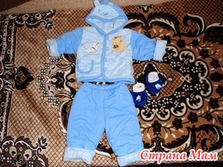 Теплый ,на синтепоне.Дл штанишек 32 см+3,5 см отворот, куртка дл 29 см, рук от плеча 20 см+4 см