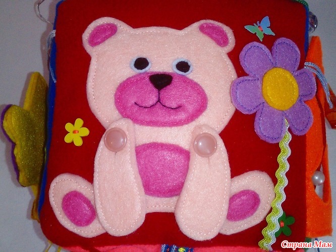 6 сторона - учимся шнуровать, открываем дверки, внутри прячется слоненок Дамбо а рядом с ним его цирковые друзья - котенок и тигренок ( пуговки декоративные). Также изучаем липучку, понятие "право-лево" на примере перемещения бусинок. Учимся их считать, показываем разные и одинаковые бусины по форме и цвету, кубик шуршит . Подойдет для деток 1-3 лет. Все детали пришиты очень крепко изнутри, можно стирать вручную. Доставка в Шелехове.