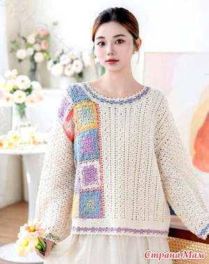 | Белый пуловер оверсайз с цветными квадратными мотивами. Крючок. | |