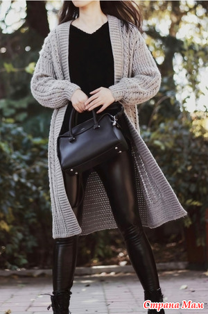 Размеры в готовом виде: обхват груди 110 см, длина приблизительно 75 см. Свободный фасон средней длины.