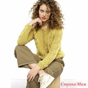 Для вязания нам потребуется 9 (10:10:12:12) мотков горчично-желтой пряжи: 50% мериносовая шерсть, 50% лён; 125 м/50 г. Спицы № 3,5 и 4. А также 5 пуговиц диаметром 22 мм.