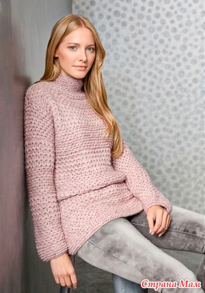 Вам потребуется: пряжа 1 (58% переработанного льна, 42% хлопка; 170 м/ 50 г) — 150 (200) 250 г пастельно-зеленой и 100(150)150 г абрикосовой; пряжа 2 (65% хлопка, 23% шелка, 12% вискозы; 120 м/50 г) — 100 (150) 200 г голубой; спицы № 3,5 и 4; длинные круговые спицы № 3,5.
