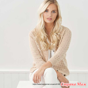 Повседневный кардиган с рукавами три четверти и круглым вырезом горловины, который можно надеть весной поверх платья или топа, выполнен простым нежным узором из дырочек ажура. Кардиган вяжется снизу вверх из отдельных деталей, которые затем сшиваются вместе.