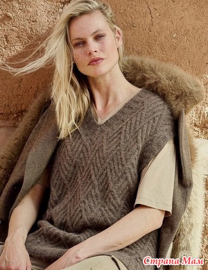 Европейские размеры: 36/38 (42/44) 48/50. Российские размеры: 42/44 (48/50) 54/56. Для вязания нам потребуется 300 (350) 400 г коричневой пряжи: 72% шерсть альпака, 16% полиамид, 12% шерсть; 190 м /50 г. Спицы № 3,5 и 4,5. А также круговые спицы № 3,5. Резинка. Рядами в прямом и обратном направлении: количество петель кратно 4 + 2 кромочные. Лицевые ряды: кромочная, * 1 лицевая, 2 изнаночные, 1 лицевая, от * повторять, кромочная. Изнаночные ряды: все петли вязать по рисунку. Читать далее»
