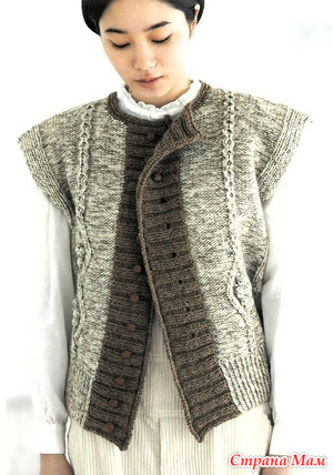 Размеры: 38/40 (42/44) 46/48 +6 российские размеры. Вам потребуется: пряжа 1 (70% шерсти, 30% кашемира; 70 м/25 г) - 400 (425) 450 г серой меланжевой; пряжа 2 секционного крашения (73% хлопка, 27% полиамида; 150 м/50 г) - 100 (100) 150 г сливочно-серой; спицы № 5 и 5,5; круговые спицы № 5; 5 (7) 7 пуговиц диаметром 23 мм. Узор 1: резинка (нечетное число петель). Лицевые ряды: кромочная, попеременно 1 изнаночная, 1 лицевая, закончить 1 изнаночной, кромочная. Читать далее»