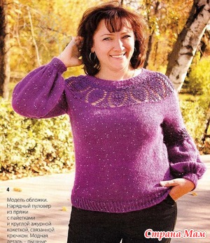 Этот пуловер с круглой кокеткой связан сверху вниз одной деталью.