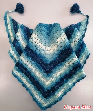 вот связалась у меня пелеринка -палантин я даже не знаю как её правильно обозвать.больше похоже на палантин.пряжа бисерная пехорка крючок 3.ушло примерно 2 мотка вид сзади а это на блокировке