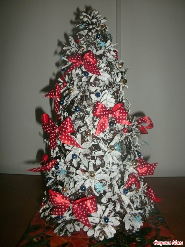 Ёлочка из шишек, украшенная бантиками и бусинками
