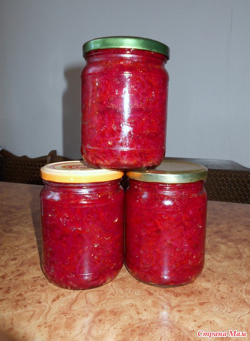 Морковь на крупной тёрке + лук полукольцами + растительное масло + соль + сахар - тушим 30 мин. Теперь сюда + буряк почищенный и натёртый на крупной тёрке + уксус - протушить ещё 10 мин. Разложить в банки (0,5 л) стерелизовать 40 мин.