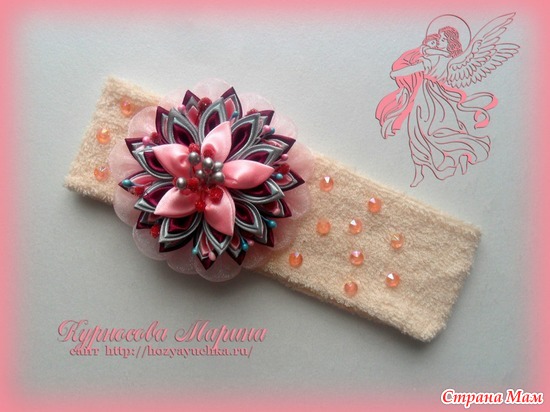 Повязка на голову для девочки.Многослойный фантазийный цветок.Атласные ленты и органза.