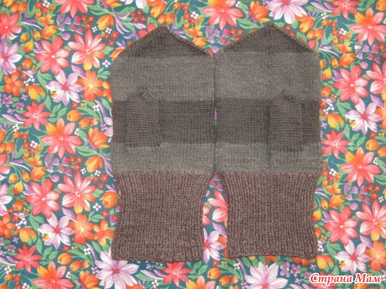 Варежки вязал на спицах с чередование полос различного цвета пряжи.