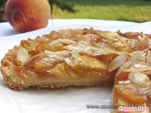 Для начинки, очистить персики от кожуры и нарезать их пластинками. Смешать с 2 ст.л. сахара, апельсиновым соком, миндальной эссенцией и крахмалом. Дать постоять 5 мин. Выложить персики внахлёст (или в произвольном порядке) на дно выпеченного коржа. Полить оставшейся в посуде жидкостью, присыпать 1 ст.л. сахара, пластинками миндаля и кусочками масла.