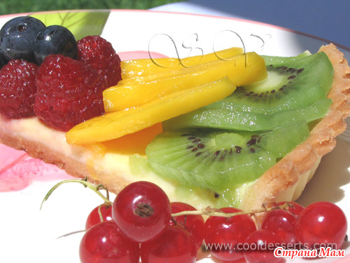 Смешать все компоненты начинки и вылить на дно пирога. Осторожно вернуть его в духовку и выпекать ещё 20 мин или пока начинка не перестанет быть жидкой. Готовый пирог охладить и украсить любыми фруктами и ягодами.