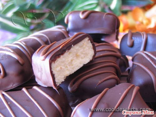 Растопить молочный шоколад и, с помощью бумажного корнетика, нанести рисунок на поверхности готовых конфет. Хранить их в холодильнике. Выход - около 40 шт.
