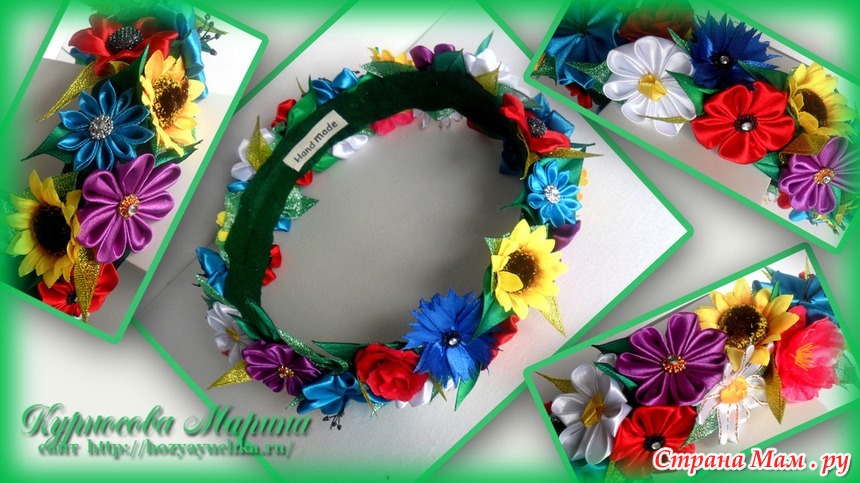 Венок на голову "Яркое лето".22 цветочка из лент и 8 искусственных.Листики - 2 оттенка зелёного цвета и золотая и зелёная парча.Внутренний диаметр 17 см(на взрослого).