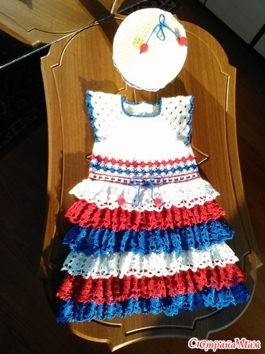 Вязала из Мисс от Ализе, ушло 370 гр на весь комплект на 3 года, длина платья 55 см