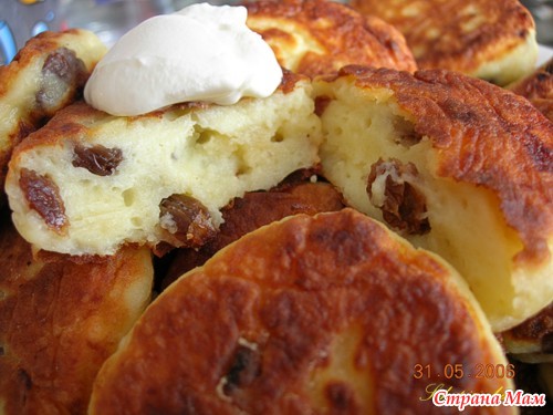 Растереть творог с сахаром и ванилином. Добавить яйца, изюм, соль, муку и перемешать. Сформировать 10 маленьких колобков. Обвалять их в муке.