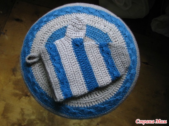 Комплект на кухню - пока один из четырех чехлов на табуреты и варежка-прихватка. Еще нужно 3 чехла, 2-3 шляпы на крышки и обычную прихватку или 2.