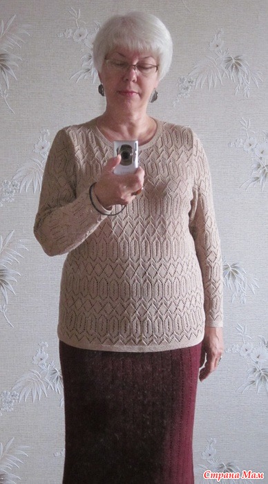 Пряжа Кутнор Sofia (100% мерсеризованный хлопок, 283м/50г), цвет 78. Спицы 1,5. Расход пряжи 320г на размер 50-52 (длина изделия 65 см).