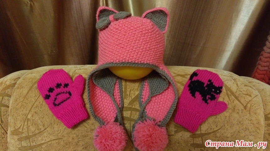 Шапка с ушками из полушерсти и варежки с вышивкой. Ушки закрыты.
