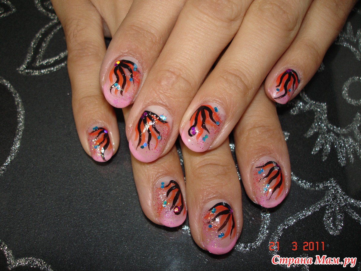 Роспись,маникюр не делала,поэтому всё кривое,это я на знакомой парикмахерше просто рисовала