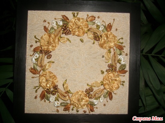 Не приклеены. Это вышивка по ткани. Ткань с лицевой стороны с атласной выработкой растительного узора. Это плохо подходило под венок, и я сделала вышивку с изнаночной стороны...