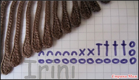 Можно сделать в виде колье. Шаг между каждой делала 2 петли ( первая кисточка 9 п, потом 11, 13. 15...)