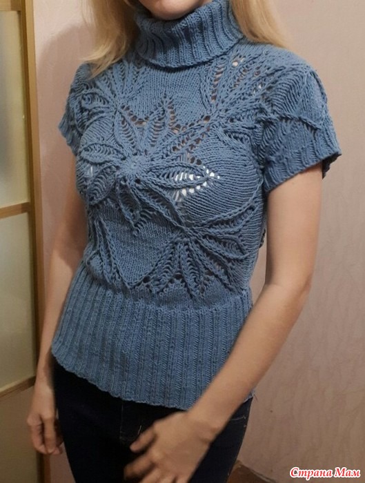 Элегантный женский пуловер связан спицами из турецкой пряжи Alize Cotton Gold. Состав: пряжи: 55% хлопок; 45% акрил.