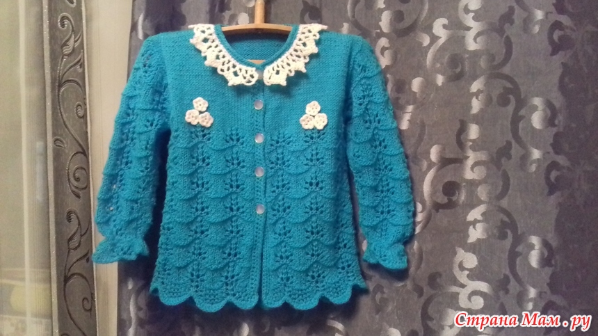 Кофточка из пряжи пехорка Детская новинка, 100% акрил, в 50 гр. 200 метров, спицы № 2,5. Ворот и цветочки связаны крючком. В манжет рукавов ввязана резинка.