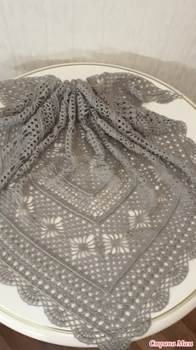Использована пряжа NAKO Moher Romantik № 11302. Состав 10% мохер, 10% шерсть, 77% акрил, 3% метал, в 100 грамм/ 540 метров. Расход пряжи 205 грамм. Размер бактуса 196х80 см., Крючок № 3,0