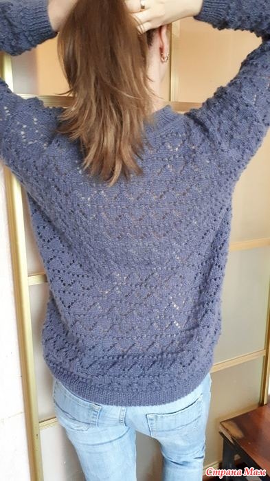 Связан пуловер из белорусской пряжи Ареола в 2 нити. Состав пряжи : 25% альпака; 26% шерсть; 49% полиакрил; 385м в 50гр. При вязании использовала круговые спицы: N2,5 - резинка 1х1; N3,5 - ажурное полотно. Размер пуловера 48-50. Расход пряжи 300гр. Пуловер получился теплый, мягкий и очень приятный к телу.